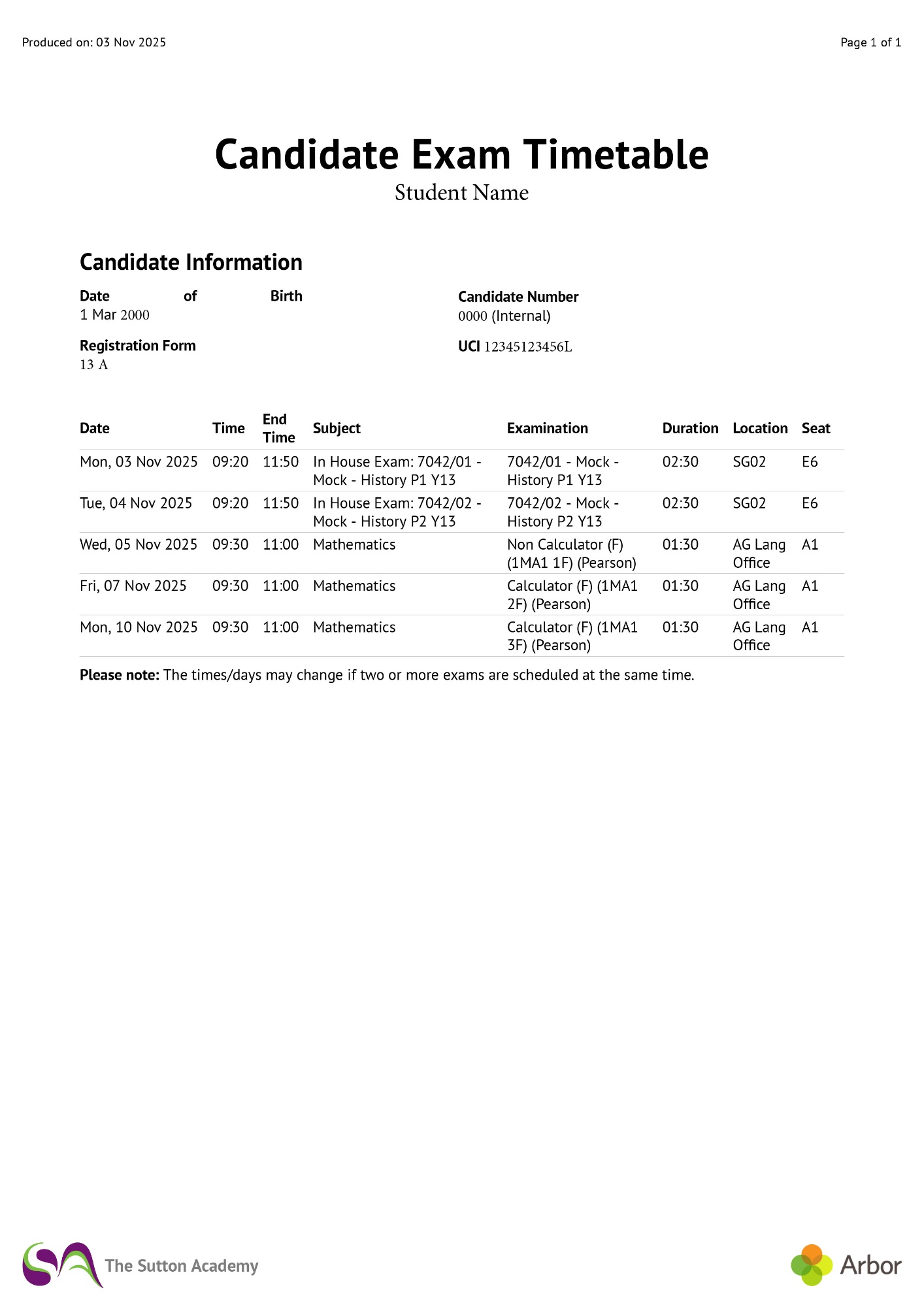 Here, you will find the latest examination timetables for all upcoming exams. This section is designed to help students and parents/carers stay informed about exam dates and times, ensuring that everyone is well-prepared. Additionally, we have provided an example timetable to give you a clear understanding of how to read and interpret the schedule.