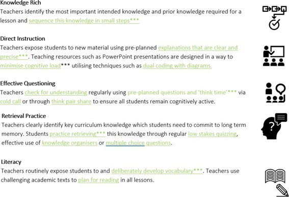 Most students’ learning needs are met through quality first teaching where class teachers use a range of evidence-informed adaptive teaching strategies. The table below demonstrates the overarching strategies that teachers at our academy apply flexibly depending on a student’s need: