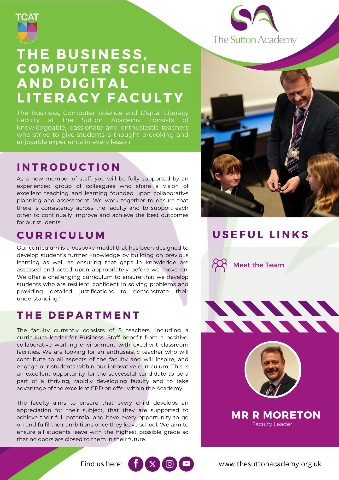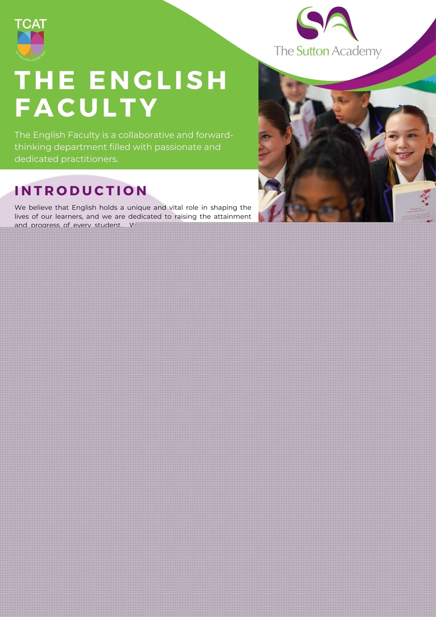 Welcome to our Faculty Overview. At The Sutton Academy, each faculty plays a vital role in delivering a broad, ambitious, and engaging curriculum. Our dedicated teams work together to provide high‑quality learning experiences, inspire curiosity, and support every student to achieve their full potential. Explore the faculties below to learn more about the subjects we offer and the opportunities available.